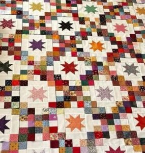Next, sew the blocks together into rows, then join the rows to complete your quilt top. Add borders if desired to frame the design and give it a polished look. Once your quilt top is finished, layer it with batting and backing fabric, then baste the layers together.